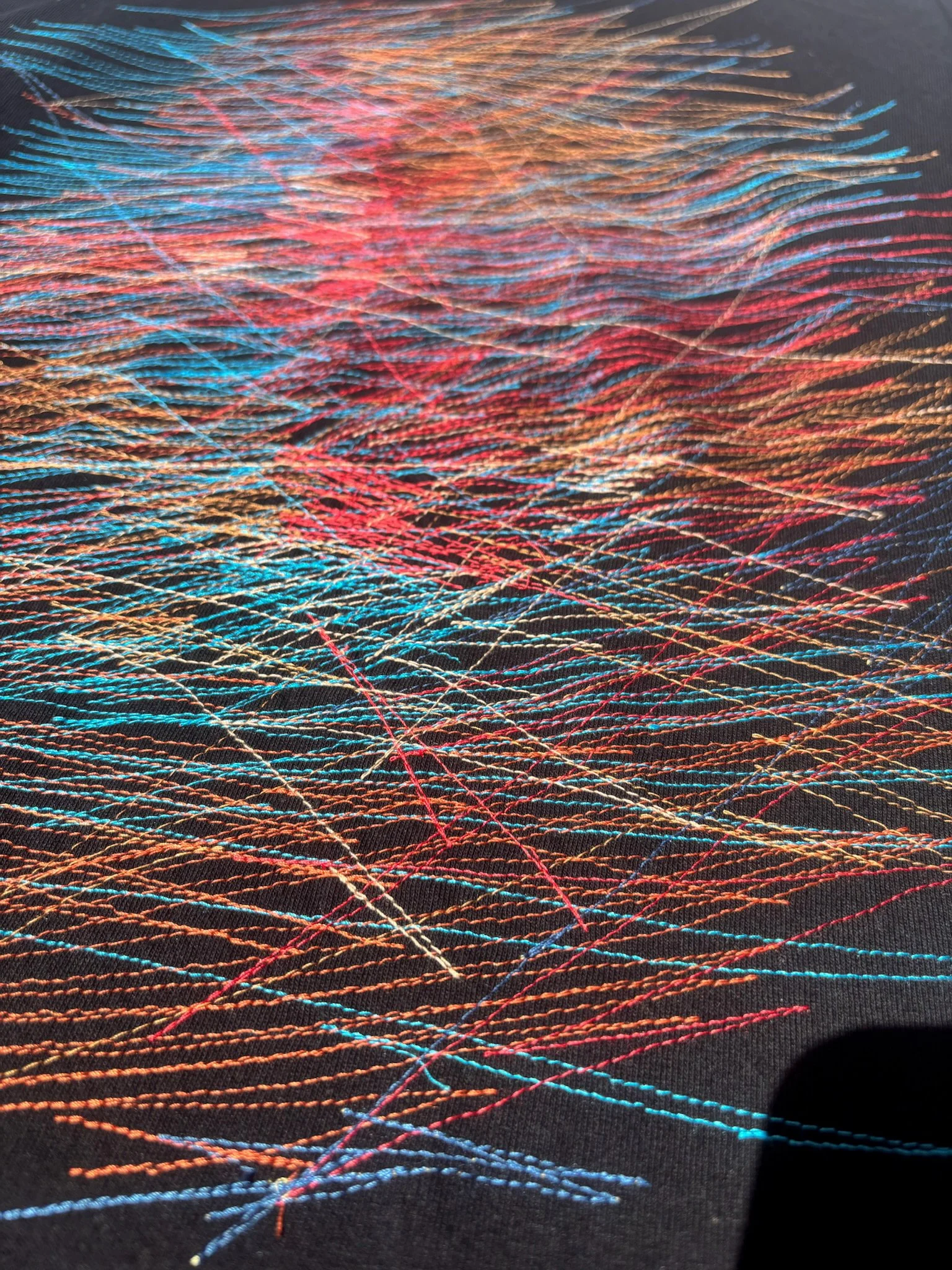 Threads over threads create a chaotic image resembling hand drawn scribbles. The very unique Correll Correll Classic is back - machine embroidery on organic cotton T-shirt in black with multi-colored thread pattern.